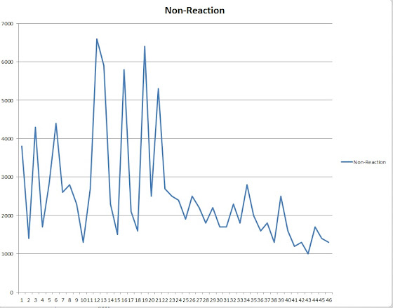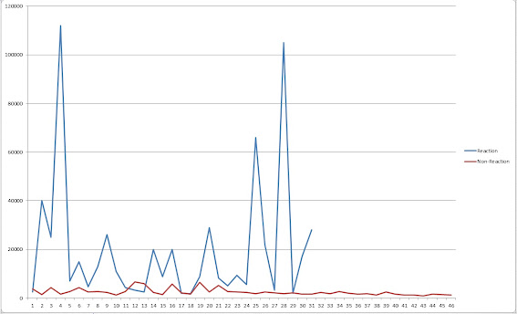 If you can’t read the numbers, it doesn’t really matter, but the x-axis is just the number of videos in sequence and the y-axis is the number of views.  The blue line is “reaction” videos and the red line is non-“reaction” videos.