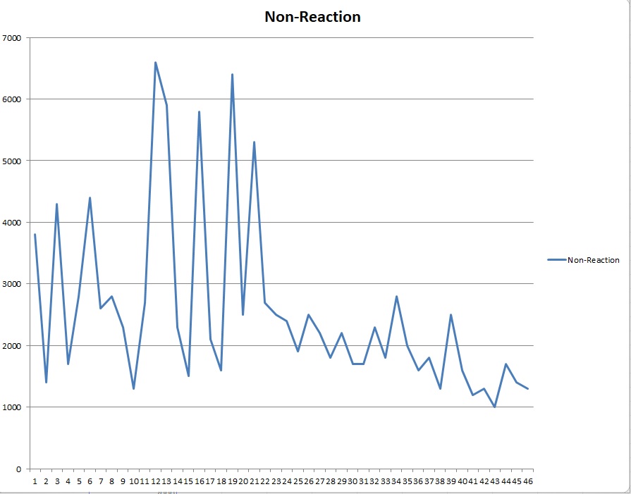 She hasn’t uploaded in three weeks and her last two videos got about 1300 views (edit: she recently uploaded a commercial for some piece of shit that some company sent her).  Indeed, I’ve been studying the numbers and none of her non-“reaction” videos do well.  Here’s a graph that I carefully prepared: