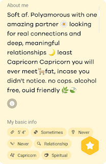 25 years old, unemployed, a 2013 graduate of the “school of clownery”, ENORMOUS, face of a man, heavily tattooed, “polyamourous” with “one amazing partner”, and smokes weed. She’s looking for “great sex”. She also states that social media is “very very hard on your mental health”. So also a crazy person, in case it wasn’t already obvious. OH. And she has her Instagram on here.