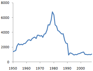 Look at this graph of GNP per capita in Iraq from 1950 to 2008.