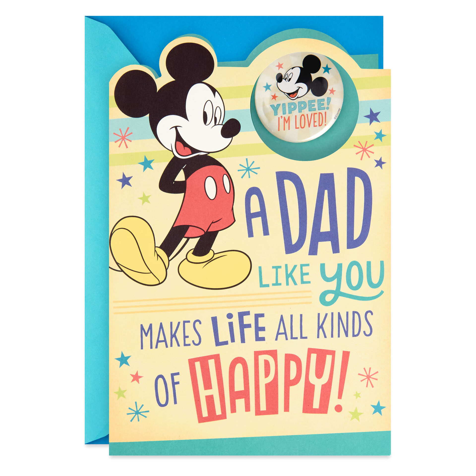 That’s just an example. Five bucks from Hallmark. They’re all pretty childish like that but that’s because adults don’t tend to give Disney cards to their father. You can still do it, though. If he likes Disney stuff, there you go. Even comes with its own pin. “Yippee I’m loved.” He’ll wear it proudly. “My 33 year old daughter got me this.” “You have my deepest sympathy.”